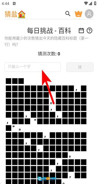2、每日挑战-百科玩法中,在输入框输入单个汉字后点击“猜”按钮,通过反复尝试,以最少的次数推测出隐藏的百科标题内容。