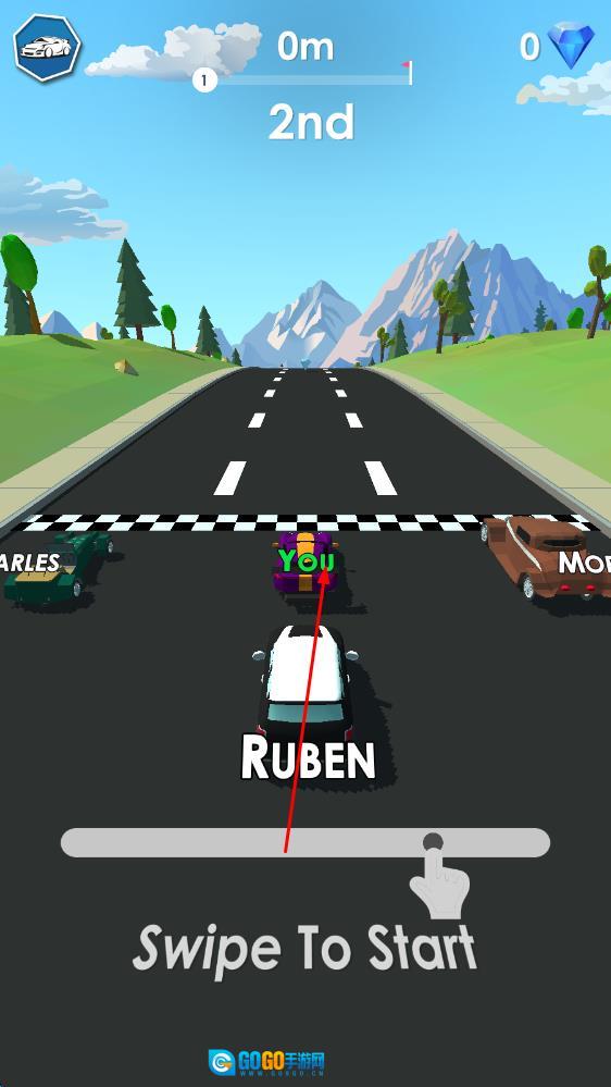 1、开启飞车追逐模式,挑选初始赛车和赛道,通过滑动屏幕来切换车道,躲开其他车辆,向着终点全力疾驰,开启这场竞速之旅。