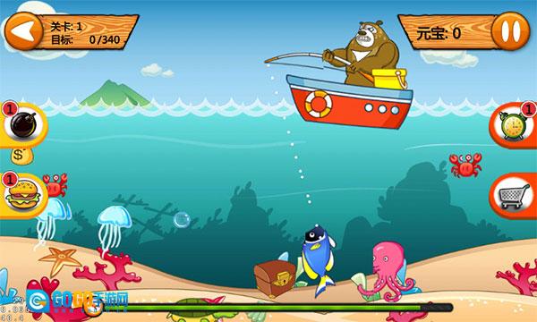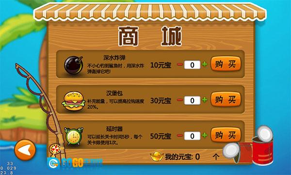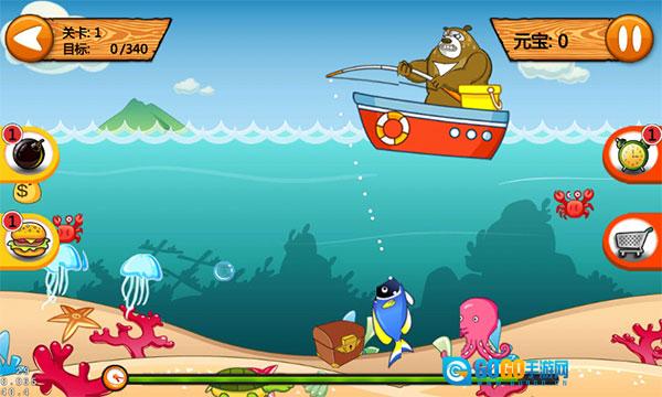 3、依据吊钩的朝向,点击屏幕就能放下吊钩,一旦触碰到任何鱼类便会自动收钩。要是不小心钓到凶猛的鲨鱼,一定要用炸弹将其炸掉。点击小闹钟能够增加游戏时长,吃掉汉堡则可以为我们补充能量,从而加快收鱼的速度。