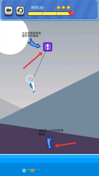 1、在游戏里,点击移走带有感叹号标识的物品,帮助鱼顺利下落。