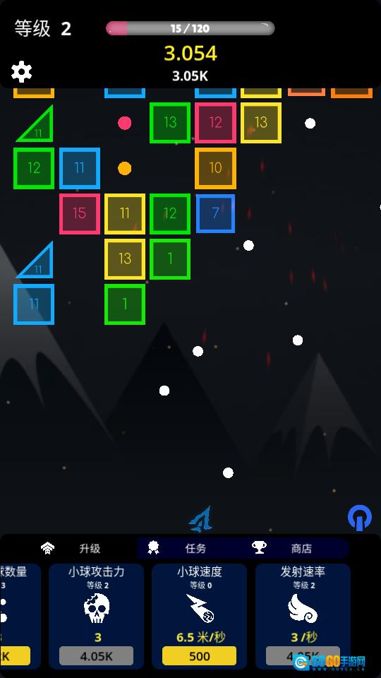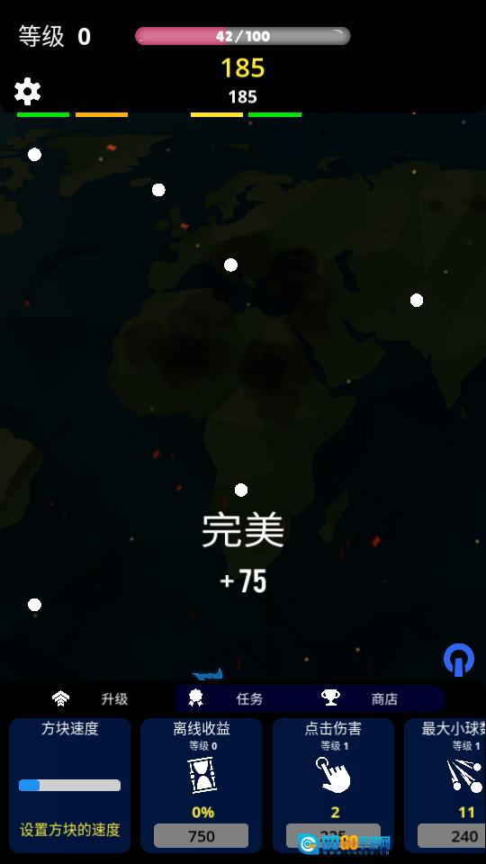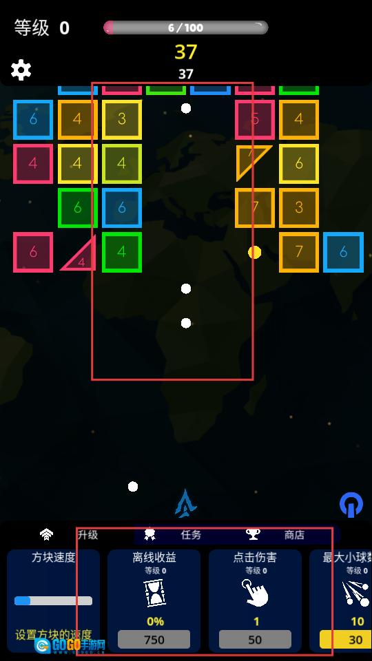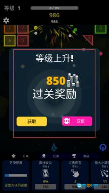 3、通过操控小球撞击彩色方块,消除方块来积累进度以提升等级,等级提升后能够领取过关奖励,这些奖励可用于强化小球的能力。