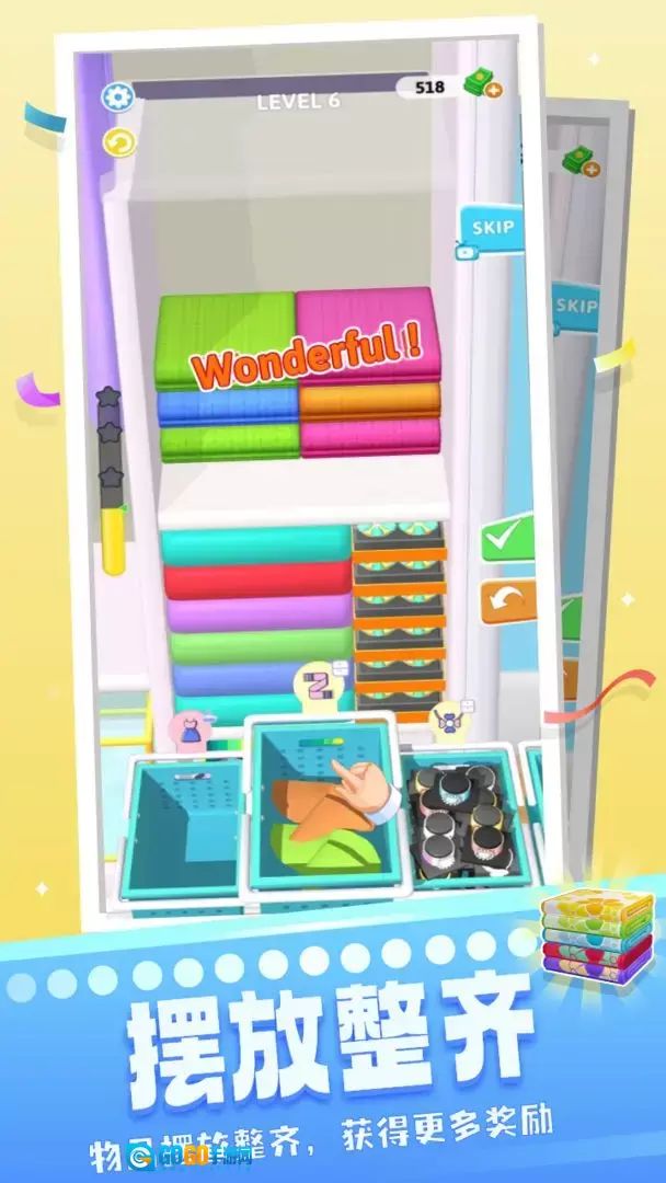 1. 游戏的美术风格清晰明快,能够为玩家营造出轻松愉悦的游戏氛围,助力玩家在游戏里更出色地发挥整理衣柜的能力。 2. 游戏内的服装资源十分丰富,有海量不同类型的服饰可供玩家进行收纳整理。在整理的过程中,玩家还能进一步熟悉各类服装的特色。