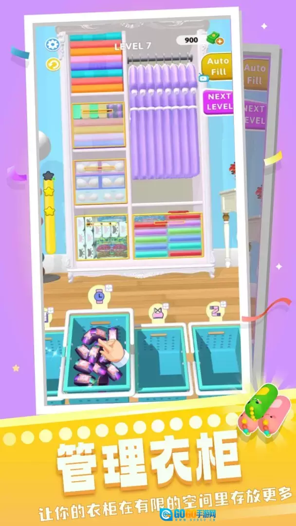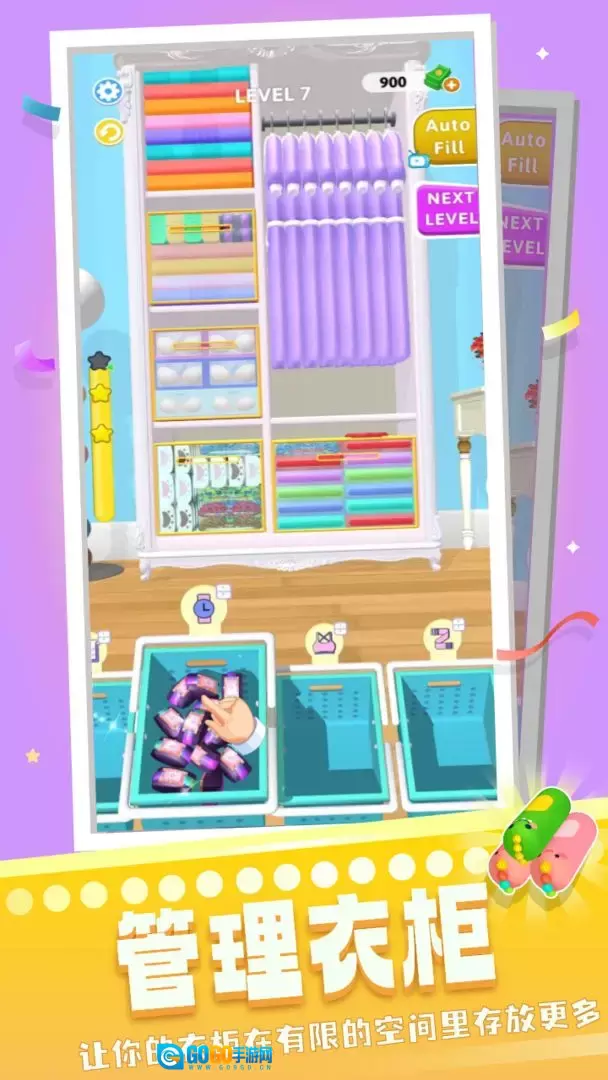 1. 这是一款以收纳整理衣柜为主题背景的休闲手机游戏。游戏采用3D立体美术风格,色彩搭配尽显优雅平和,各类道具的造型细节也十分丰富。 2. 在游戏里,玩家将化身经验老道的整理达人,需要把自己的衣物、鞋子、帽子及配饰一一归置到橱柜中。过程中会碰到形形色色待收纳的衣物,如何最大化利用有限空间,让它们摆放得整洁有序,将是你面临的最大挑战。