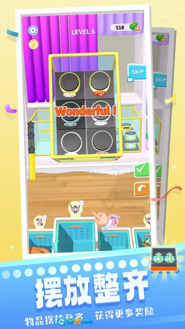 3. 魔法衣柜关卡的场景设定于一连串的橱柜之间,每个橱柜都划分出大小各异的隔间,用来收纳各类物品。你会从最基础的双层橱柜开启挑战,之后难度会逐步提升。需要把上衣、裙子、内衣、毛巾、包包、鞋子,还有皮带、手表这类衣物和配饰,都规整地放置在柜子内部。