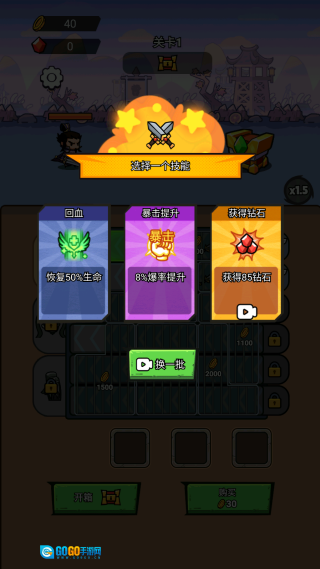 2. 成功击退一波敌人后,会获得一个技能宝箱,开启后可抽取一项技能来强化英雄的攻击力。