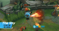 对线阶段,TheShy通常会提前把热量攒到40点左右,接着瞅准敌人技能处于真空期的时机上前发起对拼。第一步先放E(3)技能“电击鱼叉”来造成减速效果,等自身进入【危险温度】状态后,就开启喷火器持续灼烧对手。
