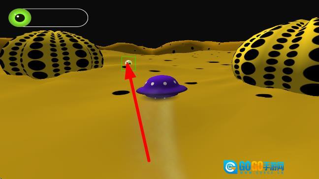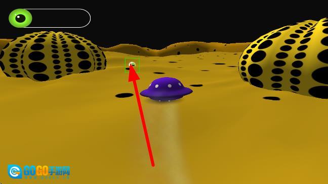2、进入场景后,我们驾驶紫色飞碟,循着箭头指示追踪绿色目标,在黄色地形区域移动,靠近并完成收集。