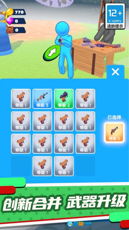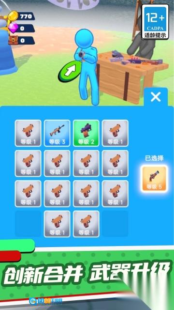 2、在游戏里收集金币和各类道具,之后进入武器界面,将相同类型的武器进行合并升级操作,以此提高武器的伤害值与射击速度,让击败怪物的过程变得更加轻松。