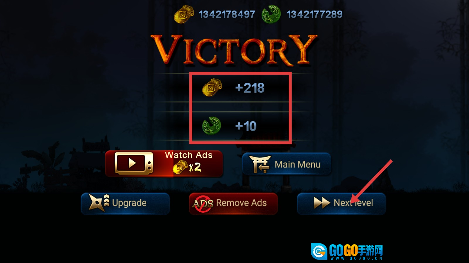 4、完成关卡可领取【+218金币】【+10翡翠】,点击【Nextlevel】,解锁后续关卡内容。
