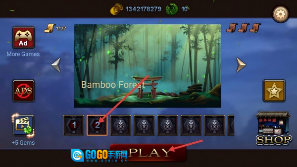 1、在主界面选择【BambooForest-关卡2】,点击【PLAY】按钮,即可进入竹林对战场景。