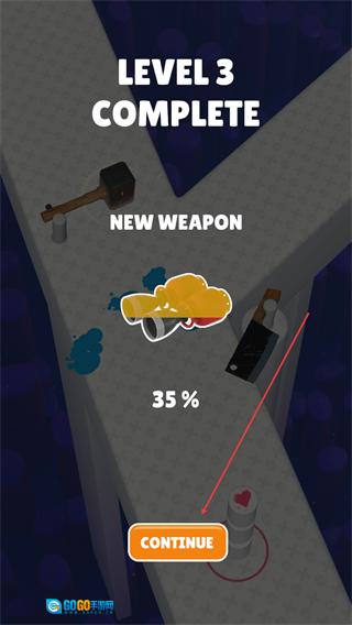 4、通过LEVEL3关卡后,会出现NEWWEAPON已解锁的提示,点击CONTINUE即可进入下一关。