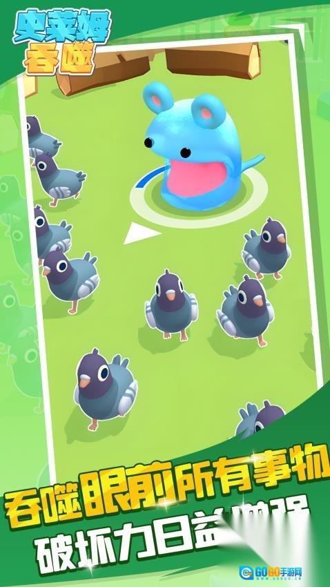 1、通过手指在屏幕上滑动,操控史莱姆移动,使其吞噬体积小于自身的物体;