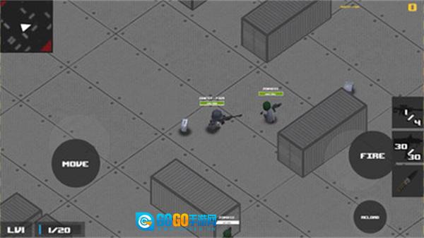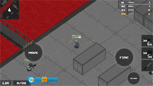 进入游戏后,你可以通过滑动MOVE按钮来操控角色移动,途中能拾取场景里的医疗箱恢复血量,还能收集XP道具以提升等级进度。