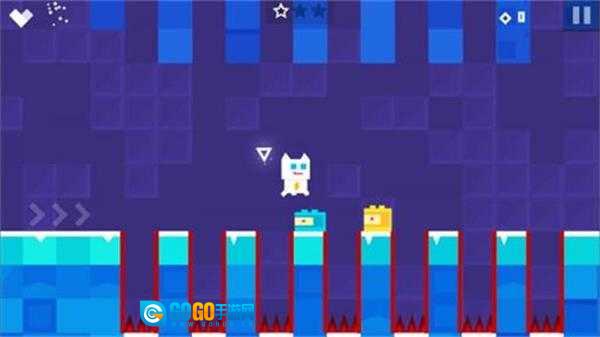 第1关:先熟悉游戏的操作界面——底部是方向键和跳跃键,顶部则显示着血量、星星收集进度与方片数量。穿过第一个小怪物后,向上跳跃击碎障碍物,就能拿到第一颗星星。这一关里藏着一条特殊路径:把绿色方块推到指定位置,借助它就能获取第二颗星星。之后会出现存档点,继续往前走,遇到喵星人时,顶开旁边的墙壁可获得额外血量。接着避开或踩掉小怪物,跳到最高处拿到最后一颗星星,就能完成这一关卡了。