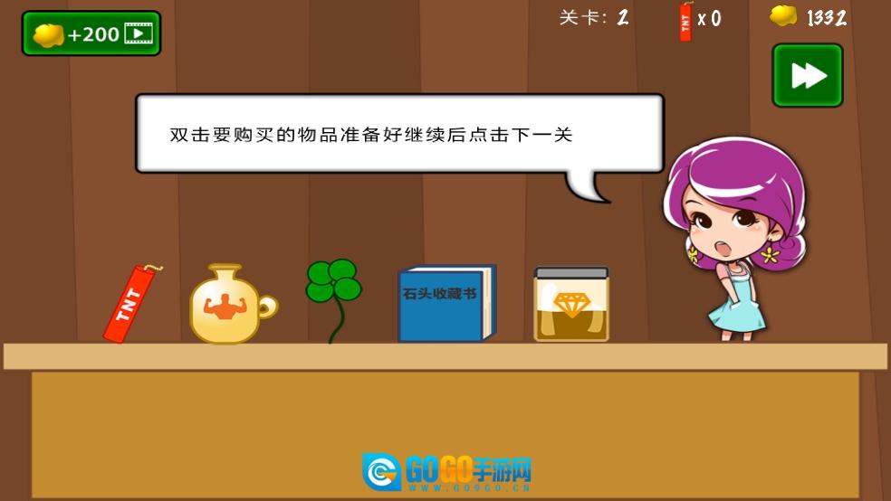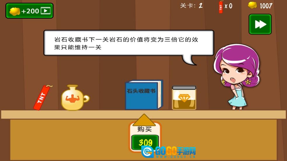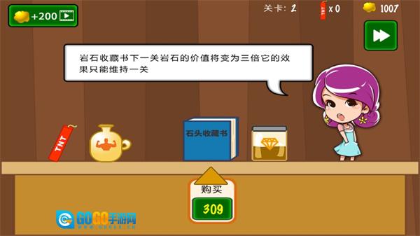 2、收集金块和宝石后,能够一步步提升钩爪的长度、速度以及承重能力,以此强化挖矿的实力,进而挑战难度更高的关卡。