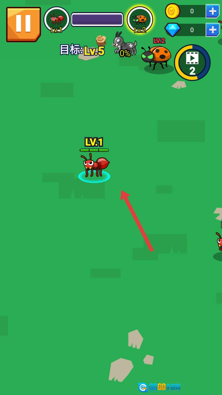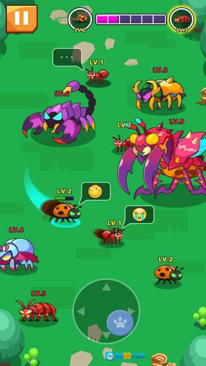 3、进入战斗场景后,玩家将操控蚂蚁,在一片绿色的地图里移动探索,寻找其他生物;通过吞噬这些生物来提升自身等级,一步步朝着目标推进。