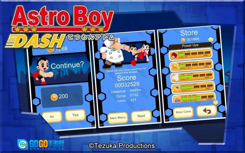 1、动画情怀元素:融入《铁臂阿童木》动画里的经典台词、背景音乐和角色(比如茶水博士、乌兰),部分关卡还原动画中的名场面,使玩家在酷跑过程中重拾童年回忆。