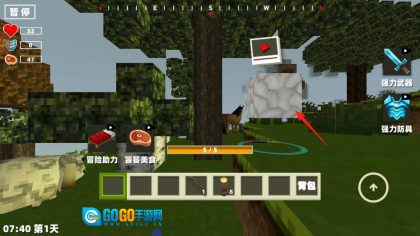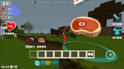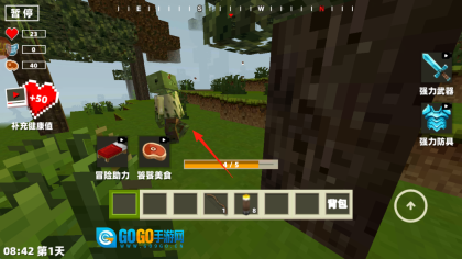 2、遇到僵尸、野狼这类怪物时,可使用快捷栏里的弓箭进行攻击,同时要留意代表血量的心形图标和代表饱食度的牛排图标,一旦血量不足就点击补充来恢复健康值。