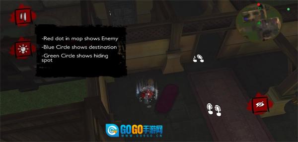 2、点击屏幕上的【灯泡图标】可以查看当前任务的提示,其中蓝色圈标记的是目标区域,绿色圈标记的是安全藏身点,合理利用这些标识能够显著提高生存的几率。
