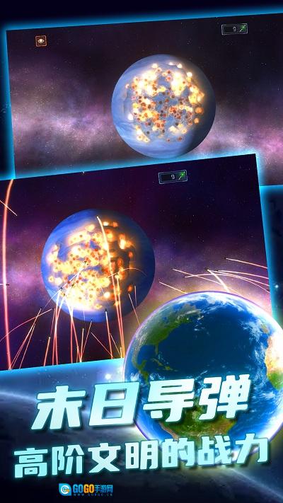 1、在浩瀚宇宙中推进你的毁灭计划,快速点击各类武器朝目标星球发起攻击,体验最具冲击力的毁灭场景。