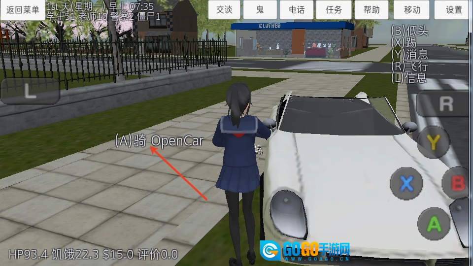 1、第一步先找到一辆停在路边的汽车,当靠近车辆时会显示“A骑”;