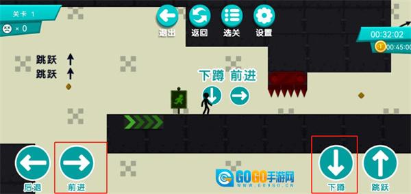 5、如下图所示,当遇到此类障碍时,玩家需点击下蹲与前进按钮以穿越障碍。
