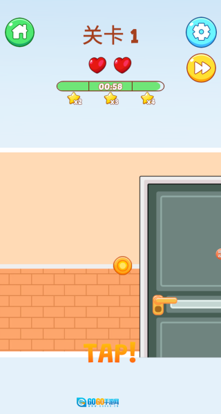 2、在关卡1里,通过持续点击屏幕的操作方法,积累金币奖励,以此推动闯关的进度。