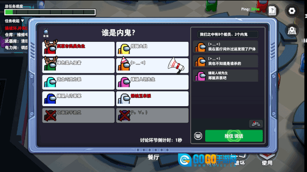 这是游戏的强制环节:当有人报告发现尸体时,所有玩家将进入讨论阶段并开启投票,得票数最高的玩家会被驱逐出空气闸。此外,游戏过程中玩家也能按下紧急按钮来强制触发讨论,不过紧急按钮的使用次数在每局游戏中是有限制的。投票时,玩家既可以依据讨论结果指定投给某一玩家,也能在局势不明的情况下选择跳过投票。本轮讨论的最终结果由得票数最多的对象(或跳过投票次数最多的情况)决定——若某玩家得票最多,该玩家将被淘汰;若选择跳过投票的人数最多,则本轮不会有玩家被逐出airlock。
