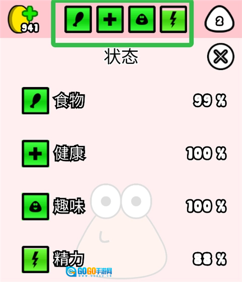 1、打开我的宠物pou,界面上方呈现的是pou在各个方面的状态信息。